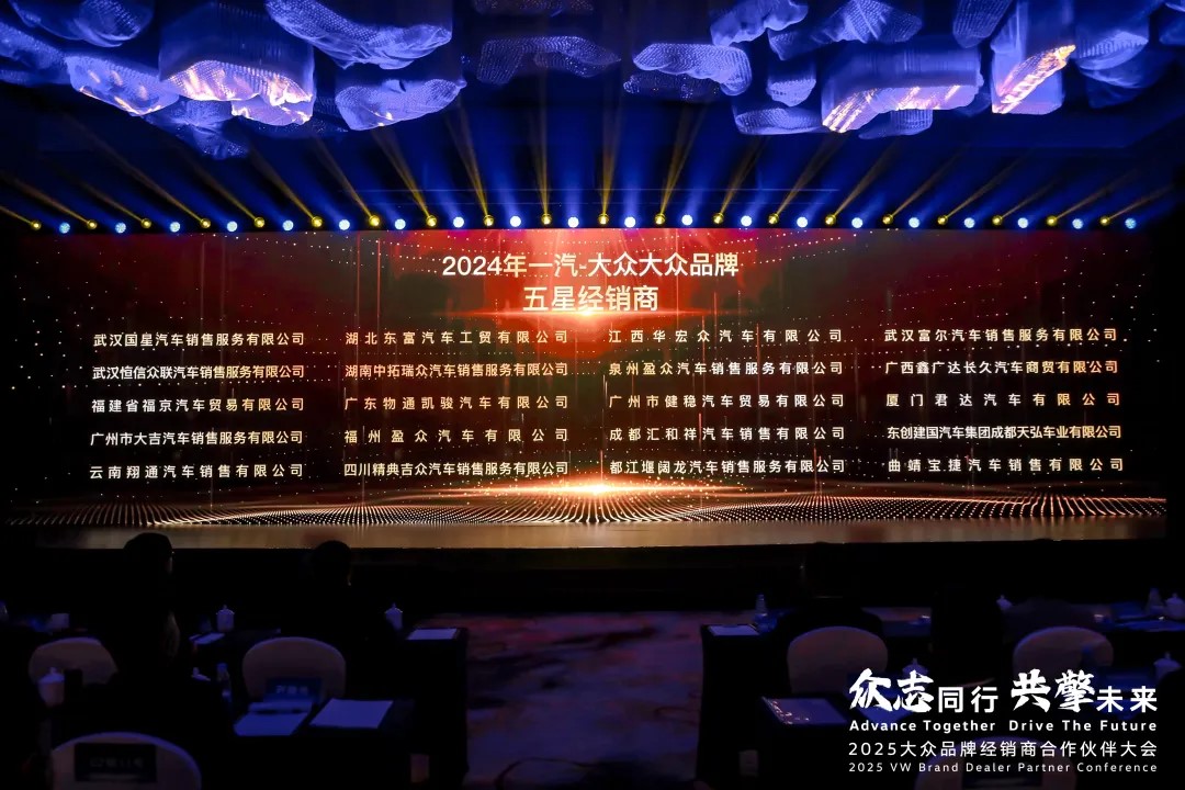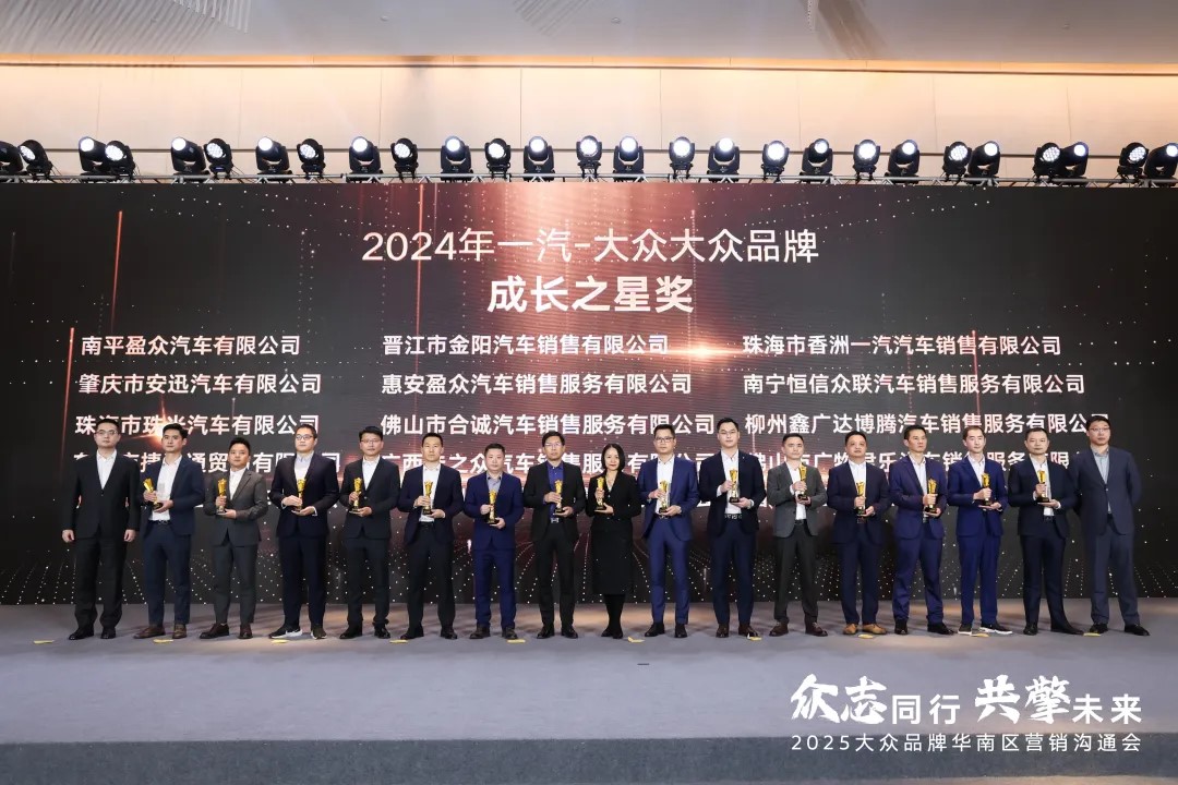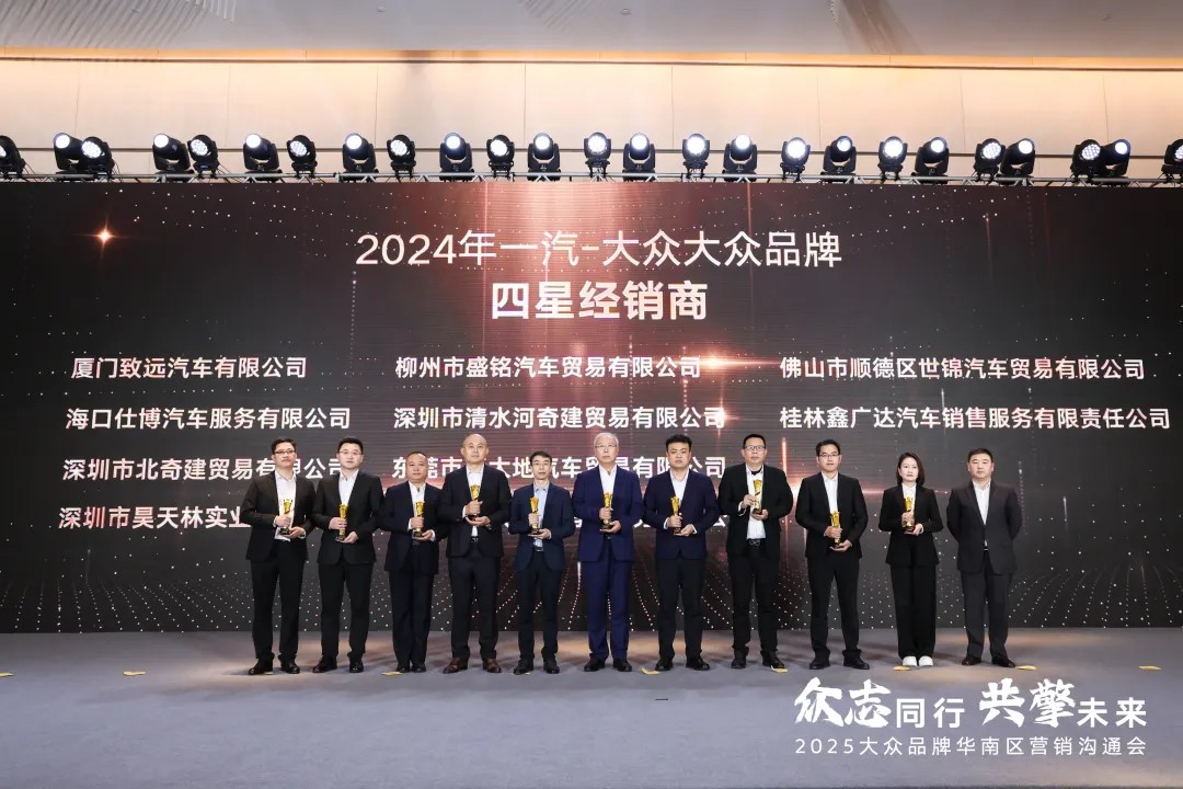近日,2025大眾品牌經銷商合作伙伴大會、一汽-大眾華南區(qū)經銷商年會相繼召開,2024年度一汽-大眾優(yōu)秀經銷商名單及個人獲獎名單新鮮出爐。盈眾一汽-大眾團隊憑借過硬的綜合實力及銷售業(yè)績、運營管理、客戶服務體驗等多維度的亮眼表現,榮獲“功勛經銷商集團”“卓越五星經銷商”“五星經銷商”“王牌總經理”等系列獎項。