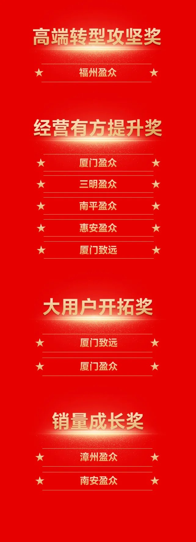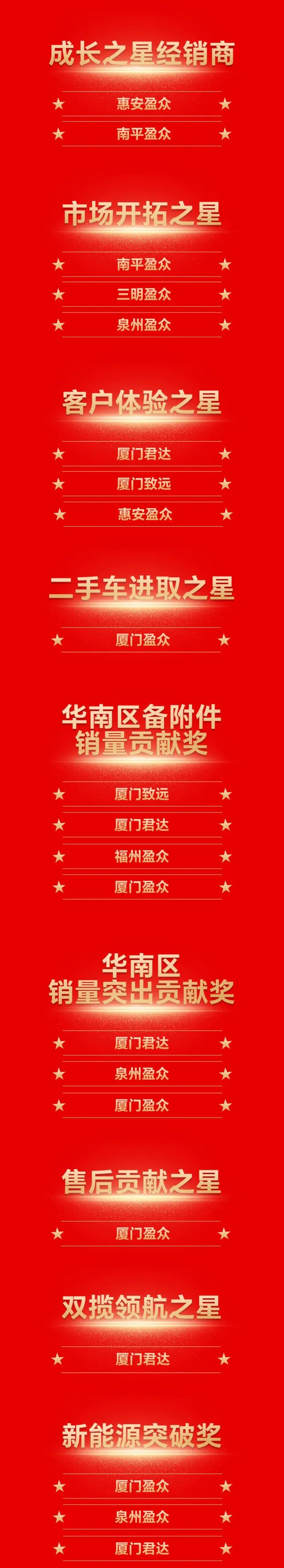 作為一汽-大眾標桿經銷商,廈門盈眾已連續(xù)16年獲得“五星經銷商”榮譽稱號,今年,廈門盈眾更是成為華南區(qū)首家獲得“卓越5星經銷商”的4S店。泉州盈眾、廈門君達、福州盈眾2024年持續(xù)發(fā)力、多點突破,入選“五星經銷商”。廈門致遠秉持初心,腳踏實地,獲得“四星經銷商”,漳州盈眾、三明盈眾也憑借不懈努力,入選“三星經銷商”,惠安盈眾、南平盈眾獲得“成長之星經銷商”。